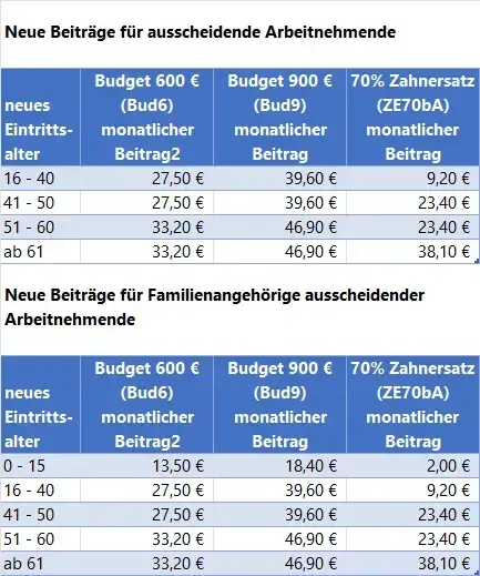 Das gilt sowohl für den eigenen Vertrag des/der Arbeitnehmenden sowie für ggf. bereits bestehende Verträge mitversicherter Familienangehörige. Der Beitrag wird pro Person zum Alter bei Austritt neu kalkuliert; Beitragsrabatte aus dem Gruppenvertrag des Arbeitgebers entfallen.